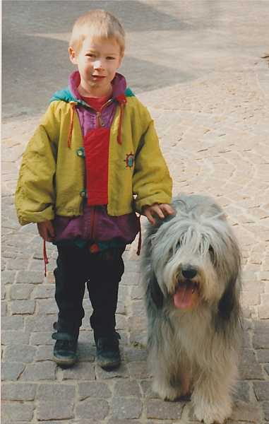 Debütanten im Ausstellungsring: Gingers und auch mein aller erster Schritt in einen Ausstellungsring, Heidmarkhalle Neumünster 1995. Ginger startete in der Jüngstenklasse, wir kamen auf den letzten Drücker dort an. Gerade noch Zeit die Jacke auszuziehen und dann stand ich auf einmal im Ring mit 14 anderen Beardie-Schönheiten im Alter von 6-9 Monaten und einem englischen Richter. Ginger gewann diesen Wettbewerb und bekam den ersten Platz! Diesen Ausstellungsstart und -erfolg werde ich nie vergessen. |